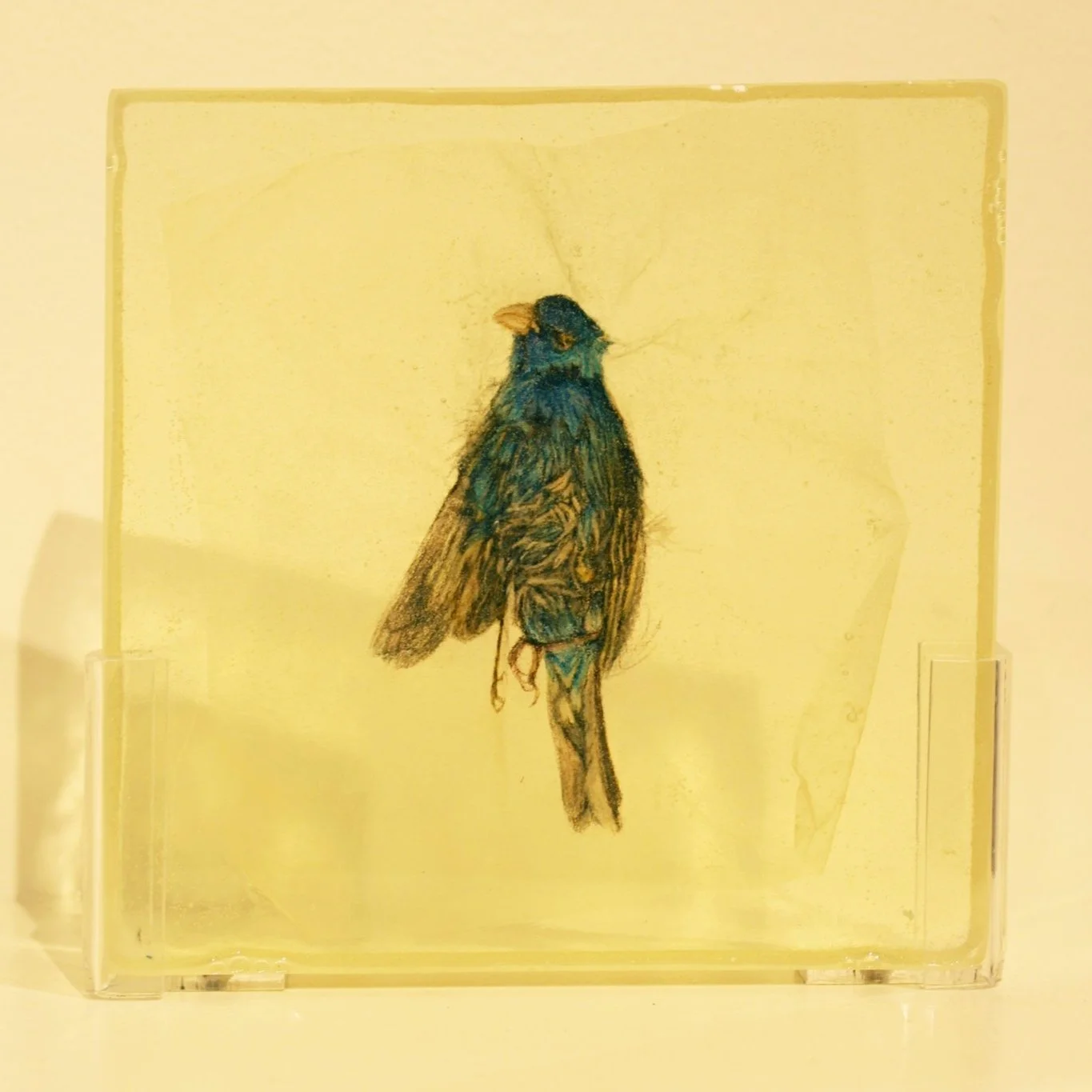 Cardinal, 2022, watercolor and acrylic on pergamenata, tissue, 11 x 14", currently in collection of Historic Arkansas Museum